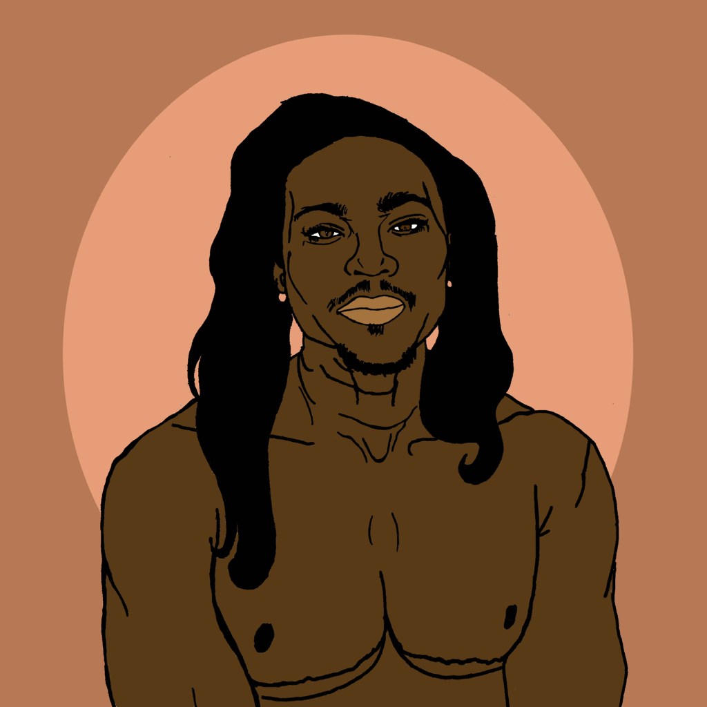Description: A portrait of a trans man sitting comfortably in their skin