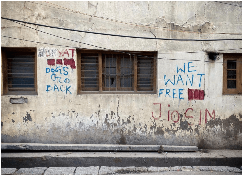 This photograph depicts a wall that was once covered in political graffiti stating “We want Freedom,” which has now been painted over by state forces in a haphazard manner using a blue colour. The painted-over phrase now reads “We want free Jio SIM,” suggesting a mocking and dismissive approach taken by the forces to the original message. The image highlights the suppression of political expression and the use of state power to silence opposing voices, thereby questioning the notion of freedom of speech and the government’s disregard for it. The act of painting over the graffiti appears to be an attempt to trivialize the demands of the protestors and their grievances, which only perpetuates the conflict and reinforces their struggle for civil rights.