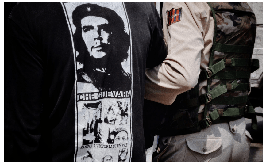 The photograph depicts a policeman arresting a man who has participated in a Muharram procession in Kashmir while wearing a Che Guevara shirt. The image portrays the tension between the two individuals, with the man’s clothing symbolizing his non-conformist views and dissenting ideology. The shirt, emblazoned with the image of Che Guevara, stands as a representation of ideas such as revolution, anti-imperialism, and social justice. The image underscores the plight of individuals who dissent against established norms and are often subjected to violence, oppression and punishment under the guise of ‘a threat to the integrity of the Indian state’.