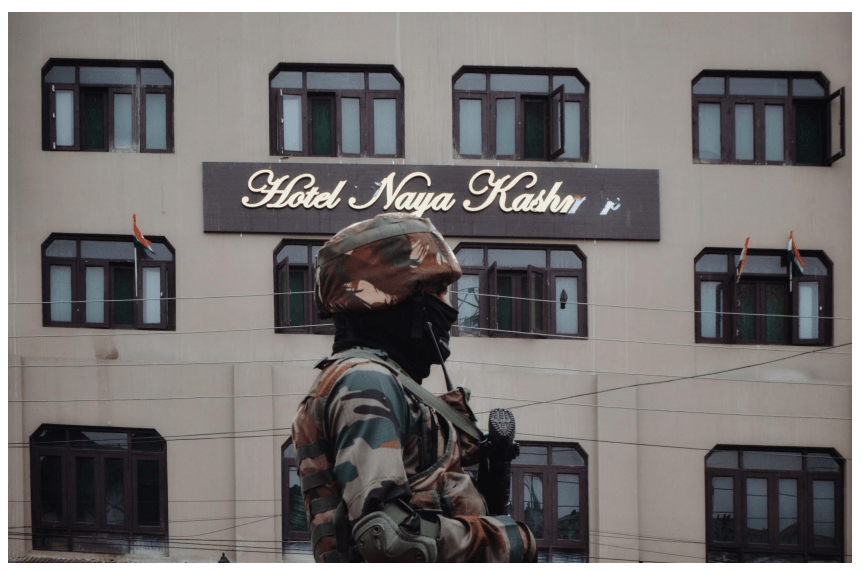 This image is of a soldier standing in front of the Naya Kashmir hotel in Kashmir’s Lal Chowk. Through its powerful visual language, the picture serves as a testament to the tragic reversal of fortunes that has befallen the people of Kashmir under the guise of ‘Naya Kashmir.’ In this context, the image poetically exposes the destruction of Kashmir’s social fabric, with the once-glistening promise of normalcy now overshadowed by a desolate reality of military occupation and governmental oppression.