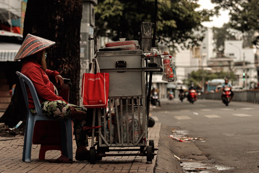 Part of a series taken in Ho Chi Minh city’s historic, revolution-filled Chinatown (Cho Lon), this photograph features a beverage vendor who has sold her wares in the same spot for the last eighteen years: refusing to budge through the years of gentrification, commercial pressure, and community change that has altered the neighbourhood, displacing hundreds of the city’s vendors in the area. I wanted to frame this shot in a manner that celebrates her tenacity, positioning her almost regally against the street that she so proudly claims as her own. For this, I drew inspiration from the colorful magnanimity David Bolen grants a group of retirees in Lance Oppenheimer’s ‘Some Kind of Heaven’.