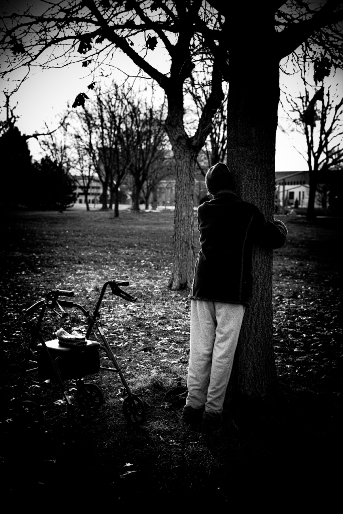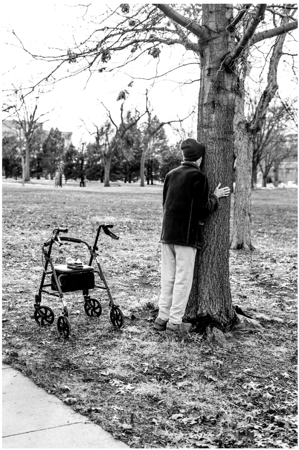 I remember a few weeks ago, sometime in December, on my often-long walks. I bumped into a scene where an old, frail looking woman removed her gloves and gently placed them on the seat of a rollator parked beside her in the dry pastures. It was a subzero temperature that day. She then proceeded to move slowly to a nearby tree and placed her palms on its bark, like it was the chest of a lost lover, then proceeded to lunge into a prolonged embrace. I stood, watching her and recognized grief. I assumed she must have frequented that tree with someone dear, and this was a ritual of retrieving whatever scent of memories that lingers in the leaves.